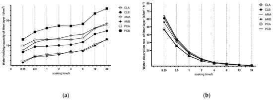 Litter water holding capacity, litter water absorption rate and soaking time process curve: (a) Litter water holding capacity and soaking time process curve; (b) Litter water absorption rate and soaking time process curve.