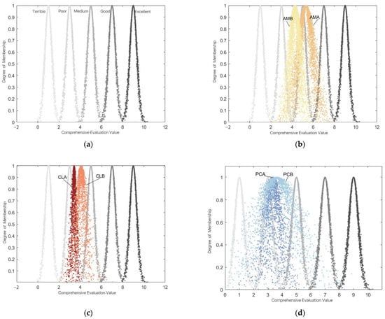 Comprehensive evaluation cloud model map of eco-hydrological function; (a): Standard cloud model of eco-hydrological function of different plantations in Hainan Tropical Rainforest National Park; (b): A. mangium plantation eco-hydrological function cloud model diagram; (c): Cloud model diagram of eco-hydrological function of C. lanceolata plantation; (d): Cloud model diagram of eco-hydrological function of P. caribaea plantation.
