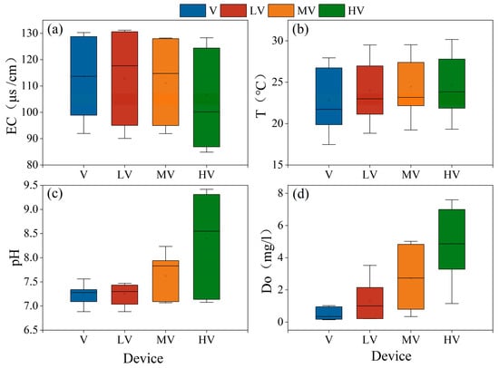 Mean value of water properties in different treatment groups: (a) EC, (b) T, (c) pH, (d) DO. (V: V. spinulosa without auxiliary light source; LV: V. spinulosa + low light duration ratio; MV: V. spinulosa + medium light duration ratio; HV: V. spinulosa + high light duration ratio).