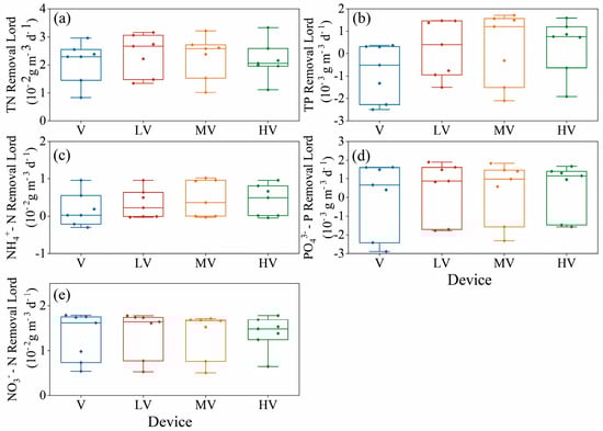 Figure 2e reveals that there was no significant difference in the NO3−–N removal load of any of the experimental groups under various settings. The possible reason is that there are enough anaerobic denitrifying bacteria in the anaerobic experimental group (V group) with DO < 0.5 mg/L to remove nitrate nitrogen [43]. In the experimental group with DO > 0.5 mg/L, NO3−–N may be removed by the absorption of NO3−–N from the soil by V. spinulosa.