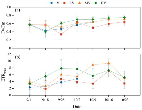 The changes in (a) Fv/Fm and (b) ETRmax in each experimental group under different light duration ratios. (V: V. spinulosa without auxiliary light source; LV: V. spinulosa + low light duration ratio; MV: V. spinulosa + medium light duration ratio; HV: V. spinulosa + high light duration ratio).