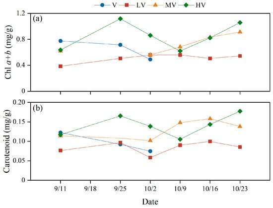 Photosynthetic pigments (chlorophyll and carotenoids) are the core part of the photosynthetic system of green plants, and any significant changes in them may affect the whole metabolism of plants [48]. The chlorophyll of the leaves of V. spinulosa was measured at intervals, and the results are shown in Figure 4. The results showed that the addition of an auxiliary light source affected the chlorophyll content of V. spinulosa. Figure 4a shows that the average chlorophyll contents of different light duration ratios are V (0.66 ± 0.25 mg/g), LV (0.51 ± 0.07 mg/g), MV (0.70 ± 0.32 mg/g), and HV (0.85 ± 0.21 mg/g). Under the influence of no auxiliary light source, the growth of V. spinulosa in V was inhibited, the chloroplast was deformed, and the chlorophyll content was reduced. The chlorophyll (Chl) cycle is a metabolic pathway in which Chl a and Chl b are converted into each other. In this pathway, Chl b is synthesized from Chl a through the catalysis of chlorophyll a oxygenase (CAO) [49]. During the senescence process with the low light duration, Chl b in the leaves of V. spinulosa Yan in V was overproduced, and the plant was not able to produce reductase to degrade Chl b during the senescence process, resulting in excessive Chl production in the plant and the accumulation of Chl metabolites and non−programmed cell death in the leaves. The analysis showed that there was a significant difference between HV and LV (p < 0.05). The results may indicate that a higher light duration ratio within a day can increase the chlorophyll content of V. spinulosa leaves, while a lower light duration ratio will reduce the chlorophyll content of V. spinulosa leaves. The increase in the total chlorophyll content indicates that photosynthesis is promoted and that the accumulation of soluble carbohydrates and biomass in plants is increased.