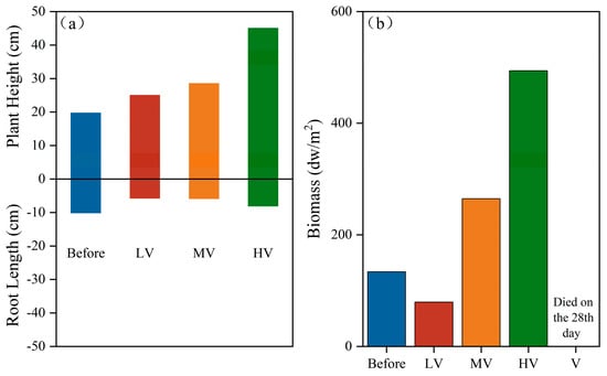 After 49 days of the experiment, the plant height with the treatment device increased significantly, and the plant height with the HV treatment device was the highest (plant height = 45.02 cm). The plant heights of MV and LV were also similar, at 28.50 cm and 25 cm, respectively (Figure 5a). The results showed that a higher light duration allowed V. spinulosa to perform photosynthesis for longer and promoted the growth of V. spinulosa. From the perspective of biomass, V. spinulosa died on the 28th day of the experiment. The biomass of V. spinulosa in LV decreased from 133.75 to 79.40 dw/m2 at the beginning of the experiment, and it basically lost its viability. The data also showed that a lower light ratio was not conducive to the growth of V. spinulosa. The biomasses of MV and LV were 264.70 and 493.97 dw/m2, respectively (Figure 5b), and previous studies found that when the PAR received by plants was in the range of 109–224.9 μmol m−2 s−1, the plant biomass increased with an increase in the light duration ratio. The analysis shows that large plants with different light duration ratios have different coping strategies to light. V. spinulosa growing in LV and MV mainly responded to low and medium light duration by regulating the biomass allocation of leaves and roots, while plants growing in HV responded to the high light duration by rapidly growing and multiplying to expand the population.