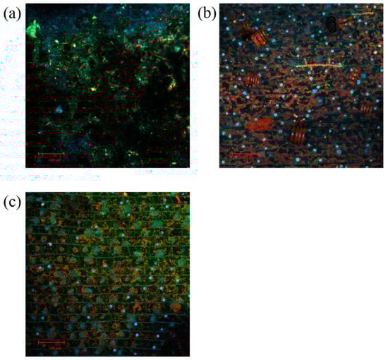 CLSM diagram of leaf–biofilm complex in different light duration ratios. (a) LV: V. spinulosa + low light duration ratio, (b) MV: V. spinulosa + medium light duration ratio, and (c) HV: V. spinulosa + high light duration ratio. Red is EPS polysaccharide stained with Texas red, green is protein stained with FITC, and bright blue is DNA stained with DAPI.