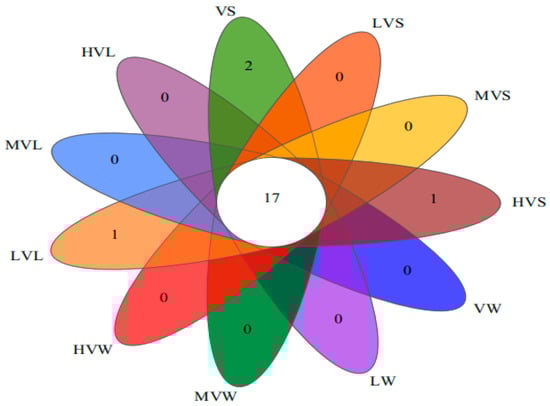 Venn diagram of gate distribution in different samples. (VW: V–Water, LVW: LV–Water, MVW: MV–Water, HVW: HV–Water, LVL: LV–Leaf surface, MVL: MV–Leaf surface, HVL: HV–Leaf surface, VS: V–Sediment, LVS: LV–Sediment, MVS: MV–Sediment, HVS: HV–Sediment).
