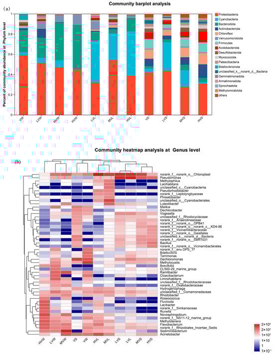 In the analysis of microbial composition at the genus level, blue represents high abundance, and red represents low abundance (Figure 8b). Similar to the analysis results at the gate level, the relative abundances of Dechloromonas, Methylocystis, Bdellovibrio, and Terrimonas in water were V > LV > MV > HV, which decreased with the increase in light duration. Novosphingobium, Lacibacter, Flavobacterium, Runella, and Roseococcus showed the opposite trend. The relative abundance of Sediminibacterium was MV > HV > LV > V, and the relative abundance of Ramlibacter was MV > LV > HV > V. The abundance under the medium light duration ratio was higher than that under other light duration ratio conditions. Limnohabitans, g_unclassified_f_Comamonadaceae, and g_CL500−29_marine_group had the highest content in LV but decreased with the increase in light duration, and the abundances in the HV group were even lower than the abundances in the V group without an auxiliary light source.