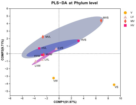 PLS−DA analysis was performed on the microorganisms in the water, leaf surface, and sediment (Figure 9) to explore the similarities or differences in the community composition between different groups of samples. The degree of difference in the species structure distribution between samples can be quantified by the statistical distance. It can be seen from the diagram that the distance between each sample of LV, MV, and HV is close, but the distance between each point of V and the rest is far. This indicates that the microbial communities between V and LV, MV, and HV are significantly different, while the microbial distribution of MV and LV is similar, with almost no difference. For LV, MV, and HV, the microorganisms on the surface of the water around V. spinulosa and its leaves were similar. The distribution distance of microorganisms in the sediment of the experimental group with different light durations is far, indicating that it has significant differences. In addition, it can be seen that the microorganisms in the water and sediment areas of V are also different.
