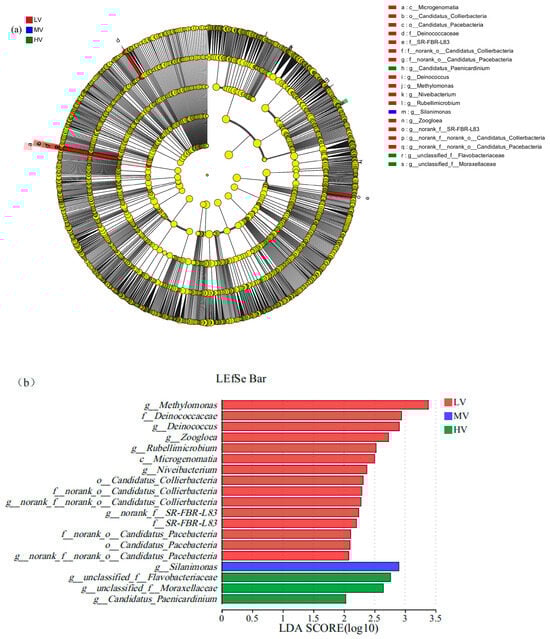 (a) LEfSe analysis of microbial abundance in LV, MV, and HV and (b) microbial markers (LDA threshold > 2).