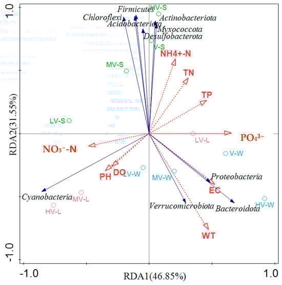 The relative abundances of Proteobacteria (27.85–43.72%) and Cyanobacteria (1.54–28.15%) were the highest in the sediment area, followed by Actinobacteriota (3.66–13.39%), Chloroflexi (5.60–11.17%), Acidobacteriota (3.20–10.74%), and Firmicutes (3.67–9.69%). Proteobacteria, Firmicutes, and Acidobacteriota are advantageous in that they participate in the processes of anammox oxidation and denitrification [56,57]. The content of Bacteroidota in each group was MV (5.56%) > HV (4.12%) > LV (3.01%) > V (2.52%), which could increase with the increase in the light duration ratio in a certain range, but the high light duration ratio reduced the abundance. Recent analyses of plant microbiota have identified the phylum Bacteroidota as a major bacterial group in the plant rhizosphere [58]. The content of Cyanobacteria in each group in the sediment area was LV (28.15%) > MV (16.27%) > V (3.8%) > HV (1.54%), which was negatively correlated with the light duration ratio. Once the light duration ratio was too high, the growth of Cyanobacteria was greatly inhibited, and even the abundance was lower than that without an auxiliary light source. The content of Verrucomicrobiota was LV (1.77%) > MV (1.02%) > HV (0.88%) > V (0.76%), and it was also negatively correlated with the light duration ratio, but the difference was that the abundance of each group under different light duration ratios was higher than that in the group without an auxiliary light source (i.e., the V group). This shows that the sediment area is the same but that not all bacteria can adapt to the high light duration environment.