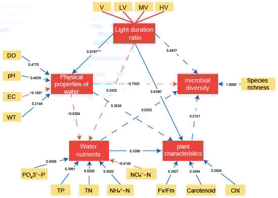 - Path analysis showed that different light duration ratios had a very significant correlation with the physical and chemical environment of water (p < 0.001) and had a significant correlation with the characteristics of V. spinulosa (p < 0.05). According to conjecture, the system mainly improves the photosynthesis ability of V. spinulosa leaves by adapting to different light duration ratios, removes CO2 in water, and increases the pH of water. After improving the physical and chemical environment of the water body, the purpose of promoting the clonal reproduction and biomass increase of V. spinulosa was achieved, which was also conducive to the removal of N and P in the water by the system. The change in water properties and the difference in the light duration ratio also affect the change in microorganisms in the system.