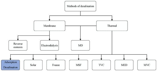 Water is regarded as the fundamental substance necessary for sustaining life. Water covers about 71% of the surface of the earth. Approximately 97% of the earth’s seawater is characterized by its salinity, while the remaining 2% comprises frozen water in the nature of glaciers and ice. Therefore, the remaining global water resources are a valuable and indispensable asset crucial for our continued existence [1]. The issue of inadequate access to clean water for a livelihood is a significant global challenge that necessitates immediate consideration. The global demand for freshwater is increasingly emerging as a significant concern. Access to drinkable water is critical for establishing human habitats in dry regions where water scarcity is prevalent [2]. Water consumption can be checked in two parts: The first part is the consumption of water for drinking and domestic use, which uses the water of some lakes and rivers and is finally purified and used. The second part of water consumption is in cooling and water needed by industries, which mainly use salty sea and ocean waters, which must first be desalinated with the help of industrial desalination methods. Various techniques have been developed and implemented for the desalination of saltwater, including multi-effect distillation (MED), multi-stage flash (MSF), and reverse osmosis (RO), which have entered the commercial market. One emerging desalination technique is adsorption desalination (AD), which exhibits significantly reduced energy usage compared to conventional desalination technologies commonly employed in the industry. The approach exhibits several advantages that facilitate the industrialization of this technology because it does not necessitate a significant amount of energy, uses wasteful and renewable energy sources, produces little pollution, and has low maintenance and repair costs. A schematic of desalination methods is depicted in the Figure 1, which shows that the adsorption desalination method is a subset of the thermal method.