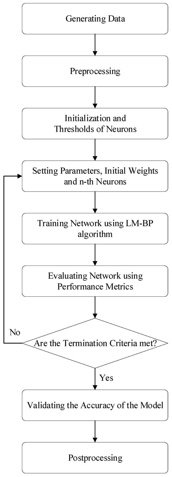 The Levenberg–Marquardt backpropagation (LM-BP) algorithm is arguably one of the most popular learning algorithms. LM optimization is often the fastest BP algorithm and is highly recommended as a first-choice supervised algorithm. In this process, the weight and bias variables are adjusted according to the LM method, and the BP algorithm is used to calculate the Jacobian matrix of the performance function concerning the weight and bias variables.