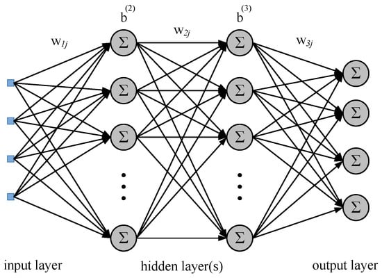 The multilayer perceptron (MLP) is the most commonly employed artificial neural network (ANN) for addressing linear and nonlinear problems. MLP is a computational model typically consisting of three distinct phases: an input layer, a hidden layer, and an output layer. Each layer comprises a varying number of neurons (Figure 4). The hidden layer(s) is responsible for processing data received from the input layer and transmitting these signals to the output layer. Nonlinear and continuously differentiable functions such as sigmoid, hyperbolic tangent, or any other suitable function can be utilized in the hidden layer. In order to optimize the effectiveness of training, it is standard to choose the linear function for the output layer. An essential concern in perceptron networks is determining the optimal number of hidden layers and neurons, typically achieved by iterative experimentation [29].