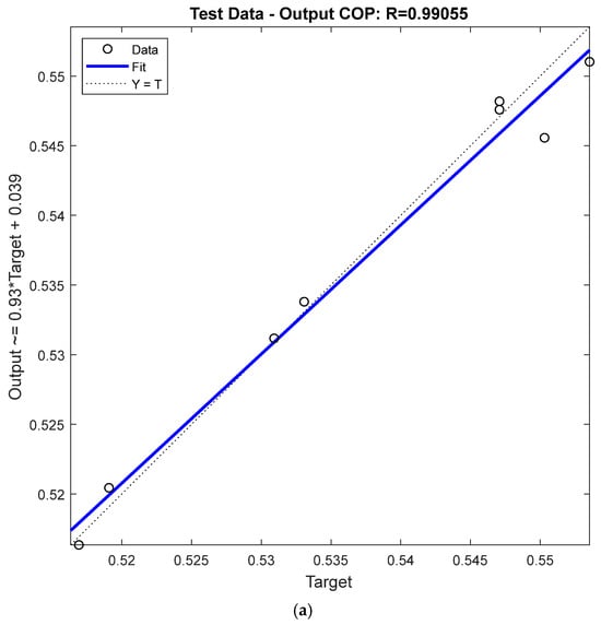 In order to evaluate the predicted models, the test data are used. Figure 6 and Figure 7 present the output results for the COP output parameter obtained from the MLP and RBF neural network models, respectively:
