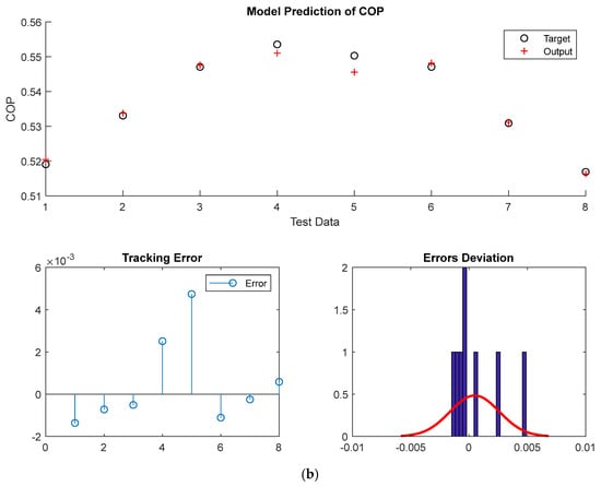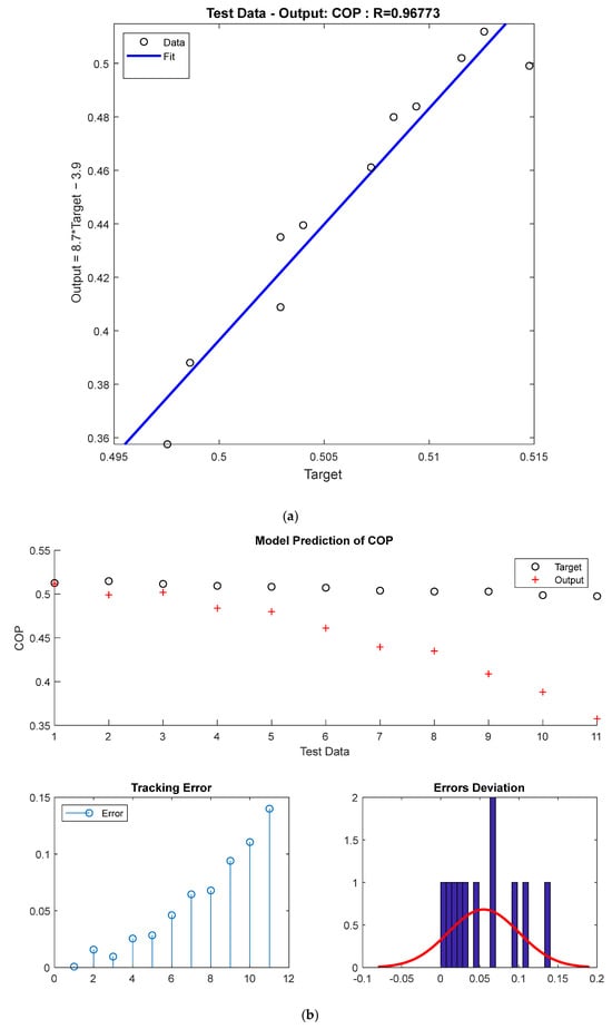 (a) Regression diagram of test data of RBF neural network for COP parameter. (b) The test data error for the RBF model in predicting the COP parameter.