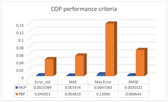 Evaluation metrics of MLP and RBF neural networks for COP parameter.