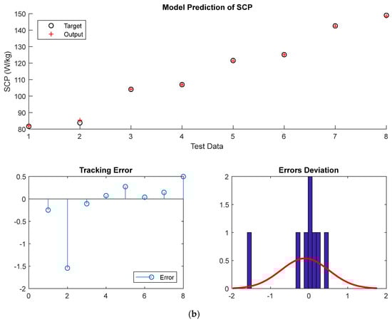 (a) Regression diagram of test data of RBF neural network for SCP parameter. (b) The test data error for the RBF model in predicting the SCP parameter.