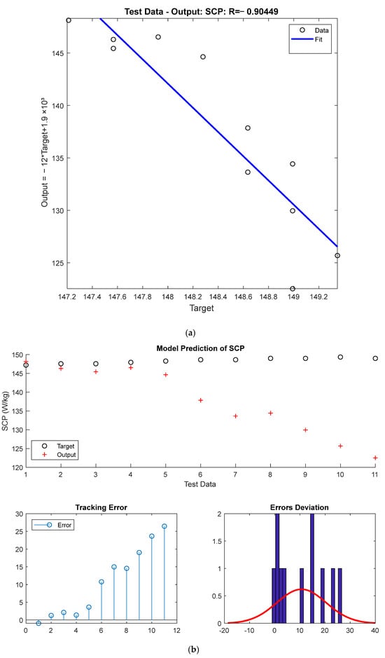 (a) Regression diagram of test data of MLP neural network for SCP parameter. (b) The test data error for the MLP model in predicting the SCP parameter.