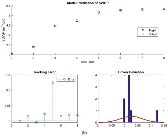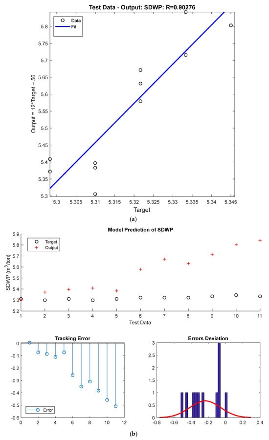 (a) Regression diagram of test data of RBF neural network for SWDP parameter. (b) The test data error for the RBF model in predicting the SWDP parameter.