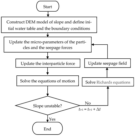 If the slope remains stable, the seepage equation for the next time increment t2 = t1 + Δt is solved. The slope is considered stable if the internal crack propagation stops and the ratio of the maximum unbalanced force to the average unbalanced force reaches 1.0 × 10−5. The micro-parameters and seepage force in the DEM are updated and the slope’s stability at that moment is assessed. If the slope becomes unstable, the calculation is terminated.