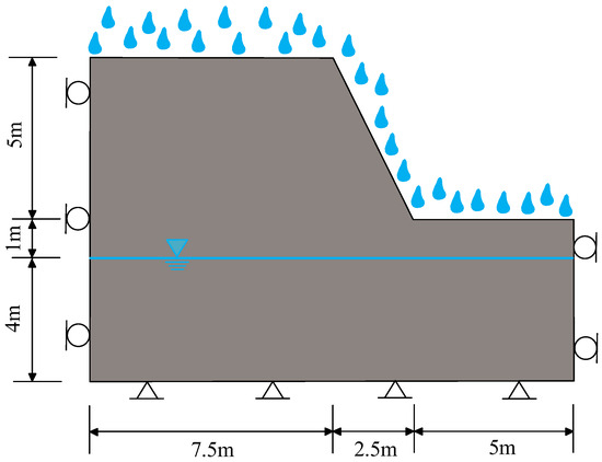 In recent years, the frequency of extreme rainfall events has increased in the mountainous regions of eastern Liaoning, China, leading to numerous small-scale landslides. These slopes are relatively low in height, with rainfall-induced landslides predominantly occurring in the shallow surface layers. To investigate the impact of rainfall infiltration boundaries, a slope was generated, as shown in Figure 2. The slope has a height of 5.0 m, with an inclination of 63.43° (1H:2V) with respect to the horizontal. The initial groundwater level is 4.0 m from the base of the slope. The natural moisture content of the soil above the water table is 21.13%.