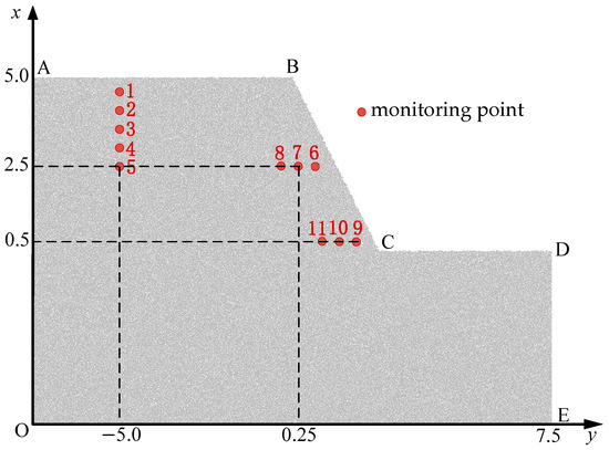 To analyze the process of water infiltration, 11 monitoring points were set up, and the coordinates of the monitoring points are listed in Table 1. The specified rainfall intensity is 0.018 m/h. To account for the influence of rainfall infiltration boundaries on slope failure, three conditions are considered: a rainfall-covered slope crest (AB), a rainfall-covered slope surface (BC), and a full rainfall-covered slope area (AB-BC-CD).