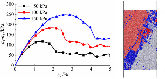 Rectangular biaxial samples were generated according to the particle size range in the slope model. Biaxial tests were conducted under confining pressures of 50 kPa, 100 kPa, and 150 kPa to determine the shear properties of the soil. The simulated stress–strain curves are shown in Figure 4 and the mesoscopic parameters used are listed in Table 2. The corresponding cohesion is 17.3 kPa and the friction angle is 23.3°.