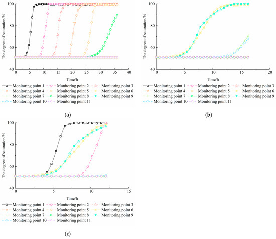 Figure 5 shows the distribution of the soil saturation degree at the monitoring points of the slope during rainfall. It indicates that different rainfall infiltration boundaries significantly affect the internal moisture distribution within the slope. As shown in Figure 5a, monitoring point 1 reached a saturation of 100% at 8.2 h when infiltration occurred at the slope crest. As the rainfall continued, monitoring points 2, 3, 4, and 5 sequentially reached a saturation of 100%. This indicated that the 3.5 m-thick soil layer beneath the slope top reached saturation. The saturation of monitoring points 6 and 7 near the slope surface remained almost unchanged, indicating that no water penetrated points 6 and 7 during the rainfall. The rate of increase in the saturation at monitoring point 8 was relatively slow. The primary cause was that water infiltrated the slope from the top, initially reaching monitoring point 8, which was located farther from the slope surface. No water infiltrated monitoring points 7 and 6, which were closer to the slope surface, and the saturation at monitoring points 9, 10, and 11 near the slope toe showed no change, confirming that no water entered the slope toe. This observation aligned closely with the results of the modeling experiment reported by Bao et al. [28].