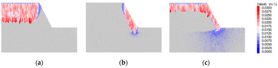 Vector field of the seepage velocity of the slope in different rainfall infiltration scenarios: (a) rainfall-covered slope crest; (b) rainfall-covered slope surface; (c) full rainfall-covered slope area.
