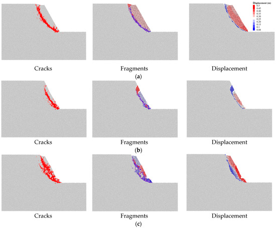 To investigate the impact of rainfall infiltration boundaries on slope failure patterns, the distribution of cracks within the slope, landslide debris, and displacement conditions during slope failure were compiled, as shown in Figure 7. Figure 7 shows the distribution of cracks, debris, and displacement in the context of slope failure under different infiltration boundary conditions. The cracks are mainly distributed along an arc-shaped sliding surface under the rainfall-covered slope crest conditions, as shown in Figure 7a. The sliding mass is relatively intact, exhibiting a wide top and narrow bottom. The sliding mass has the largest volume, and the landslide body remains fairly intact, sliding downward as a whole.