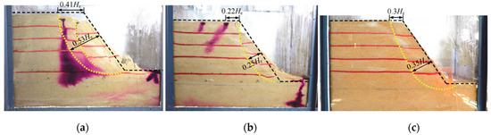 These results are consistent with the results of a model experiment on sandy slopes (Figure 8) conducted by Song et al. [29], which indicates that the rainfall infiltration boundary significantly influences the slope failure mode.