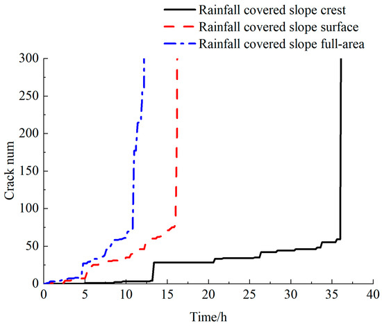 The evolution of the crack number during rainfall is depicted in Figure 9. It shows that the crack propagation patterns in the slope body are similar. Initially, cracks develop slowly. However, once the threshold of slope failure is reached, the number of cracks rapidly increases, ultimately resulting in complete slope failure. Under rainfall-covered slope crest conditions, the first crack appears at the slope toe after 5 h of rainfall, and the cracks suddenly enlarge at 36.8 h. As explained in Section 4.1, the water does not infiltrate the slope toe during failure, leaving the soil strength unchanged due to the absence of rainfall infiltration. It can be inferred that the main reason for failure is that rainfall infiltration increases the soil’s unit weight and downward seepage forces, thereby enhancing the sliding force. For the rainfall-covered slope surface, a significant increase in cracks occurs at 16.2 h, followed by rapid crack growth, leading to slope surface failure at 16.6 h. Rainwater infiltrates the failure surface, and the weakening of soil strength, seepage, and increased soil unit weight caused by the water leads to soil failure. At 0.4 h, cracks appear at the slope toe under full-area infiltration conditions. A significant mutation occurs at 11 h, and, by 12.4 h, the cracks grow continuously until complete penetration and slope failure. Comprehensive slope infiltration includes two working conditions that negatively impact slope stability, crest infiltration and slope surface infiltration, which accelerate the slope’s failure process.