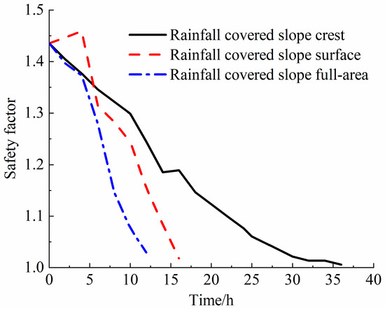 The evolution of the slope’s safety factor during rainfall is illustrated in Figure 10. For the rainfall-covered slope crest, the slope has the longest stable period. The slope with a full rainfall-covered area has the shortest period of stability. The safety factor under the rainfall-covered slope crest and full-area conditions monotonically decreases as rainfall infiltration proceeds. Under slope surface infiltration conditions, the slope’s safety factor first increases and then rapidly decreases. The peak value of the safety factor appeared at 4 h. This conclusion is consistent with the conclusion of He et al. [45]. They found that the embankment slope’s safety and stability factors increased within the first 24 h of rainfall.