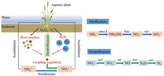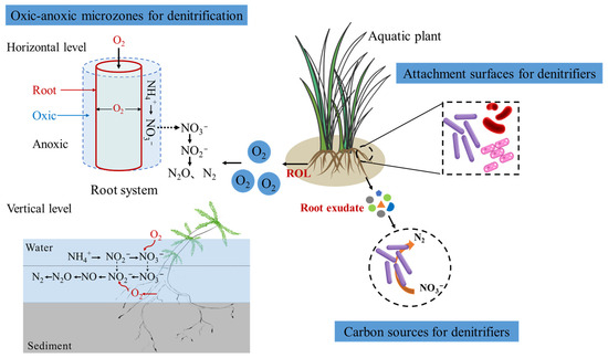 Aquatic plants impact denitrification through alteration of environmental conditions and interactions with denitrifying microbes [41]. A meta-analysis across 419 wetlands showed that plants increased the rate of denitrification by an average of 55%, and their effect differed significantly among plant communities [41]. The beneficial effects of plants on denitrification have been documented in several studies. For instance, the Phragmites australis rhizospheres had substantially higher potential denitrification rates and a greater abundance of denitrifiers [42]. Similarly, Typha latifolia increased the abundance and activity of denitrifiers in the CWs [43]. Aquatic plants may contribute to the increased denitrification process through several mechanisms (Figure 1). First, the plant can enhance the abundance and activity of the microbes in its surroundings by establishing a niche for the microbes to access the root surfaces [31,32]. Second, plants may secrete root exudates, which act as a carbon source for denitrifiers [33]. Root exudates, which contain a variety of organic compounds such as sugars, amino acids, and organic acids, serve as carbon sources for denitrifying microorganisms in the rhizosphere [28]. The composition and quantity of root exudates can selectively enrich specific denitrifying taxa, thus shaping the microbial community structure [44]. For instance, Zhang et al. (2022) found that phenolic root exudates from Phragmites australis significantly enriched denitrifying bacteria [45]. Third, plant ROL creates an oxic-anoxic interface at the horizontal or vertical scale, which is crucial for the coupling of nitrification-denitrification processes. The oxygen released by roots supports the growth of nitrifying bacteria, which convert ammonium to nitrate, subsequently serving as a substrate for denitrification in adjacent anoxic zones [26,28]. Moreover, macrophyte species with higher ROL capacity enhanced denitrification, attributed to the increased prevalence of ammonia oxidizers and the strengthened coupling between nitrifying and denitrifying communities [46].