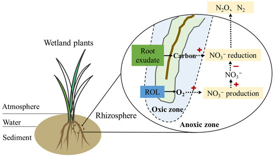 Denitrification is one of the main pathways for N removal, during which nitrate is converted to gaseous nitrogen, thus being completely removed from systems [12,13]. The denitrification process in CWs is affected by various environmental variables including oxygen content, nitrate supply, and the availability of carbon sources [14,15]. Aquatic plants could influence these variables because of their special characteristics, among these, radial oxygen loss (ROL) and root exudates are considered the most important factors [16,17]. The most notable feature of CWs is that they are located in regions that experience intermittent or persistent flooding [11,18]. To survive in hypoxic environments, plants transport oxygen produced during photosynthesis to the rhizosphere through the aerenchyma, thereby satisfying their respiratory requirements and discharging a portion of the oxygen into the root zone. This process, known as radial oxygen loss (ROL), is a unique adaptation of aquatic plants to waterlogging [18]. ROL reduces root damage caused by the accumulation of harmful reductive compounds such as ferrous iron and sulfide [8,18]. Most of the literature has focused on the multi-functions of aquatic plants in CWs, as it provides colonizing habitats for microorganisms, influences the conditions of the rhizosphere, and alters the availability of nutrients [19,20]. Nevertheless, the synergistic effect of ROL and root exudates on denitrification is not yet fully understood.