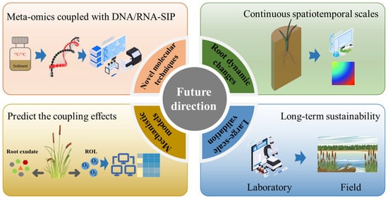 Future research should focus on the following aspects: (1) develop new in situ monitoring technologies, such as microelectrode arrays, microfluidic chips, nanobiosensors, to improve the resolution of the spatiotemporal dynamics of ROL and root exudates of wetland plants; (2) integrate multi-omics technologies and SIP to deeply reveal the coupled mechanism of ROL and root exudates on the microbial communities; (3) construct multi-scale mathematical models to elucidate the quantitative relationship between the coupling effect of ROL and root exudates and its regulatory mechanism on key biogeochemical processes; (4) strengthen field studies to evaluate the ecological significance of the interaction between ROL and root exudates and its contribution to the ecosystem service function of CWs.