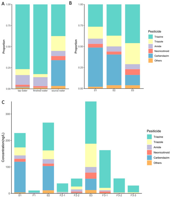 Profiles of pesticides and metabolites in drinking water. (A) Profiles of pesticides in different types of drinking water; (B) profiles of pesticides in different source water; and (C) median concentrations of pesticides in different source water and related finished water and tap water (S: source water; F: finished water and tap water).