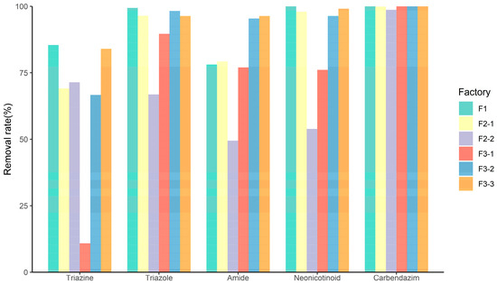 The six DWTPs sampled in this study all employed O3-BAC advanced treatment technologies. The removal rates for five pesticide families across different DWTPs are shown in Figure 2. Carbendazim exhibited the highest removal rate, with all DWTPs achieving above 98%, while triazine had the lowest removal rate, ranging from 10.8% to 85.5%. Xu et al. [46] found that the C=O double bond in carbendazim can be easily broken by hydroxyl radicals during the ozonation process, yielding an intermediate product. Furthermore, carbendazim’s lower molecular mass, smaller volume, and simple structure (with only one methyl group) make it more easily adsorbed by activated carbon, contributing to a higher removal efficiency [20]. The low removal rates for triazines may be due to the presence of triazine metabolites. When considering only parent compounds, removal rates ranged from 43.6% to 100%. In addition, the presence of polar functional groups, such as chlorine in the aromatic rings or stability of the triazine rings also results in poor removal efficacy [47].