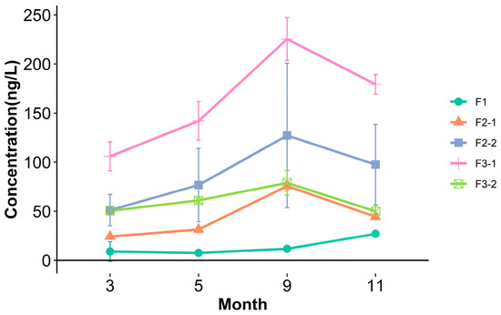 The median concentration for carbendazim was 83.5 ng/L, ranked first in all detected pesticides and metabolites, followed by atrazine with a median of 50.7 ng/L. Both of these pesticides were detected at concentrations exceeding 100 ng/L in some samples. Carbendazim is a widely used broad-spectrum benzimidazole fungicide and is also a metabolite of benomyl and thiophanate-methyl [41]. It is commonly detected at high concentrations in food [42] and soil [43]. Hence, it is not surprising to observe its high detection rate in surface water, as a result of surface runoff. Similar findings have been reported for surface water in the Taihu Basin [16,17].