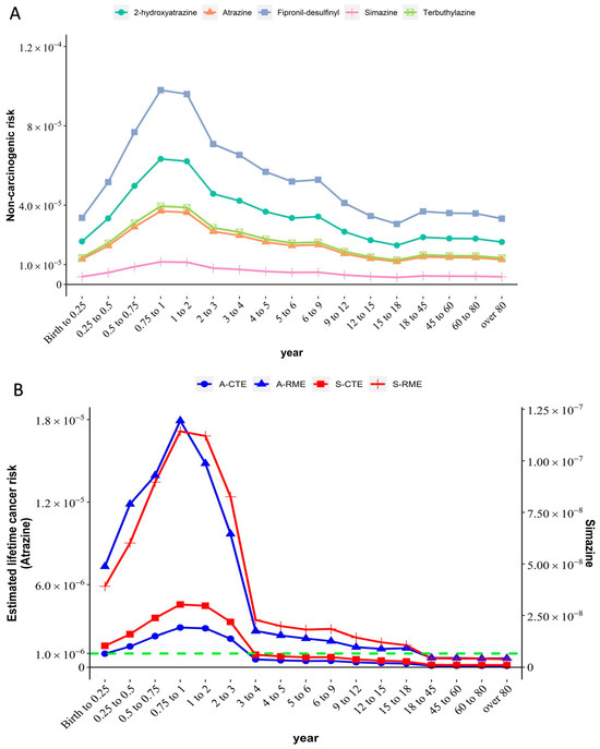 Risk assessment of the detected pesticides and metabolites in tap water by age groups. (A) The five pesticides and metabolites with the highest estimated non-carcinogenic risk under the central tendency exposure scenario; (B) estimated lifetime cancer risk under both the central tendency exposure scenario and reasonable maximum exposure scenario (A: atrazine; S: simazine; CTE: central tendency exposure; RME: reasonable maximum exposure).