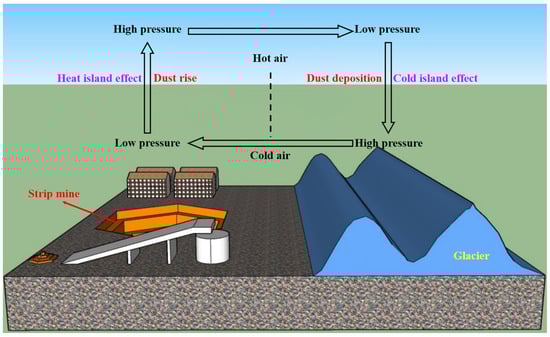 A large amount of heavy metal mineral dust particles are produced in metal mines during drilling, blasting, transportation, and other processes. Air flow results in the movement and diffusion of dust and greatly influences the migration path and distribution range of heavy metal dust particles [5]. Glacial and snow-covered areas reflect solar radiation, maintaining lower temperatures and creating a cold island effect. Conversely, mining activities and exposed rocks absorb solar radiation, leading to increased local temperatures and forming a heat island effect. In cold-region mines, these effects coexist, and the temperature differences between these temperature islands can cause pressure variations that subsequently alter local airflow patterns. Heavy metal dust particles migrate to the surface of glaciers and the surrounding environment under the local circulation and the “cold and heat double-island effect” of mines in cold regions, resulting in the diffusion of heavy metal elements (Figure 1 and Figure 2).