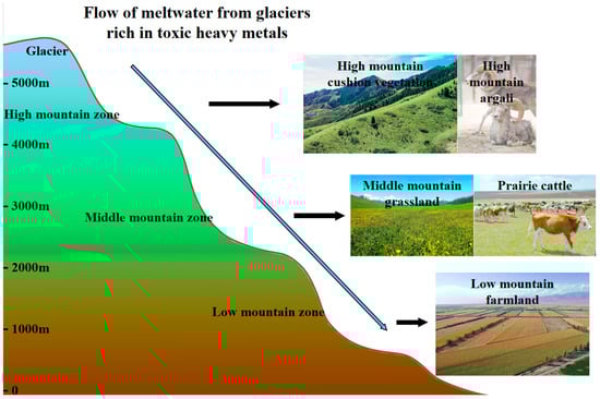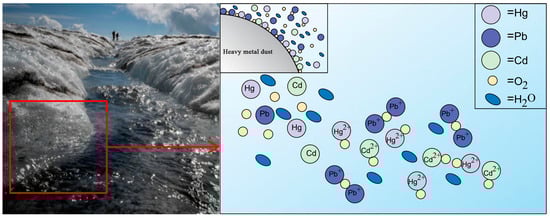 In extremely cold, high-altitude areas, mountain glaciers, known as “solid reservoirs”, recharge regional surface water and groundwater by melting, nourishing the vast downstream areas. Their consistent material balance (accumulation and melting) allows the sustainable development of social economies and the ecological environment in the region [7,8]. With the annual changes in temperature and climate in these regions, glaciers generated by freezing will seasonally melt in summer and freeze in winter, and the heavy metal elements on the surface of glaciers will undergo a series of physical and chemical changes during this annual freeze–thaw cycle. For example, heavy metal elements are affected by oxygen, light, and temperature; when these factors change, the valence state of the ions, and their toxicity, will also change [9,10]. As glaciers melt, heavy metal elements will accumulate seasonally in the meltwater, threatening and influencing the aquatic ecosystems and water resources in downstream rivers [11,12] (Figure 3).