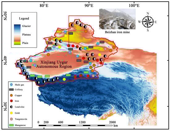 The study area was the Beizhan iron ore mines in Bazhou–Hejing counties in China’s Xinjiang Uygur autonomous region. Large conventional and strategic mineral resources are distributed in these alpine and high-altitude regions. Altai Mountain, Kunlun Mountain, Tianshan Mountain, and other orogenic belts are rich in gold, silver, copper, iron, and other metal mineral resources, representing critical mineral resource reserves in China [25] (Figure 4). Most of the strategic mineral resources are distributed along the glaciers of the alpine region and range widely in number, variety, and level of strategic exploitation. The study area is defined by the coordinates E 85°31′59.72″~E 85°34′37.96″, N 43°13′30.25″~N 43°15′45.92″, which includes the metal mine and its adjacent piedmont glacier. The central geographical coordinates of the study area are as follows: E 85°33′22.11″, N 43°14′45.04″.