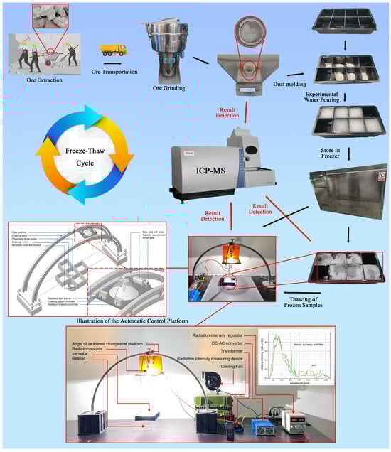 The effects of the freeze–thaw cycle on the content and chemical state of heavy metal elements in heavy metal dust samples were investigated by laboratory physical simulation experiments. First, raw samples were collected from different areas of the study area, and powdered samples were obtained through milling. The dust samples were pre-processed with a standard sieve and pre-analyzed using inductively coupled plasma–mass spectrometry (ICP-MS) to ensure the operation and accuracy of the experiment. Physical simulations of the freeze–thaw cycle were then performed. Mine heavy metal dust and glacial mineral water were injected into square freezer molds, which were then frozen. After freezing, representative samples were selected for composition analysis, and the results of the freezing stage were recorded. The remaining samples were fed into an automated control platform device to simulate the all-weather glacier melting process. Xenon lamps were used as light sources to simulate the natural solar spectrum during the thawing stage of the experiment. After thawing, a representative sample was selected for compositional analysis (Figure 5).