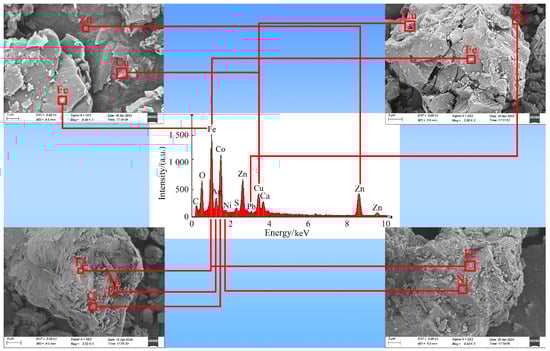 The SEM images (Figure 6) indicate that the Fe is attached to the surface layer of dust particles in large quantities, Zn and Ag are attached to the middle and inner layers of dust particles, and small amounts of Co, Cu, Ni, and Pb are attached at different positions.