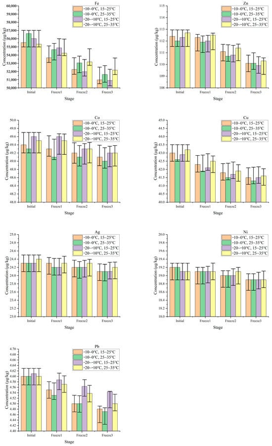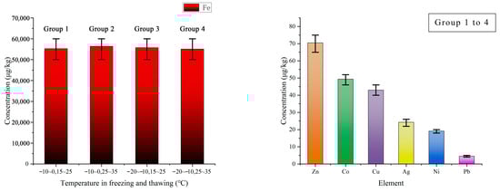 The concentration changes in each heavy metal element under different freeze–thaw cycle temperatures are also different within the same group of experiments. Freezing temperature has little effect on the concentrations of Fe, Zn, Co, Ag, and Ni; however, for Cu and Pb, a lower freezing temperature results in a higher metal concentration.
