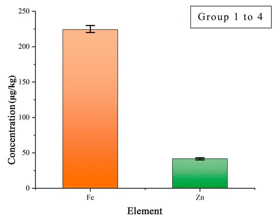 ICP-MS was used to analyze the concentration of all heavy metal elements in the initial experimental water for each set of experiments. After we excluded heavy metal elements with negligible concentrations in the detection results, the remaining heavy metal elements were Fe and Zn. The concentrations of these metals are shown in Figure 8.