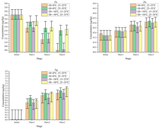 The concentration changes in each heavy metal element under different freeze–thaw cycle temperatures are also different within different groups of experiments. A higher temperature during thawing results in higher Fe and Ag concentrations; however, thawing temperature has no effect on the concentrations of Co, Cu, Ni, and Pb, which are all close to zero. Temperature also has little effect on Zn concentration during the entire thawing phase.