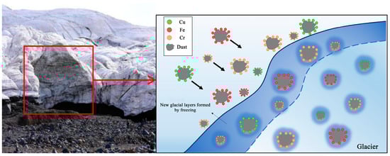 Dust particles from the mine production process containing heavy metal elements are substantially enriched at the surface of glaciers under the influence of ice freezing (Figure 11). At specific pH and REDOX conditions, heavy metal elements are transformed into ions or different forms, which may be more toxic. Therefore, the heavy metals that are enriched at the surface of glaciers migrate and transform during the freeze–thaw cycles of glacial ice, and they can enter downstream rivers with glacier meltwater (Figure 12).