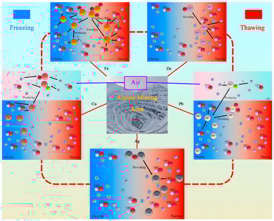 The dual effects of cold islands and heat islands in mines located in cold areas will lead to the outward diffusion of heavy metal dust from the mines, and the freeze–thaw cycle of ice and snow will provide the necessary environment for enrichment and conversion of heavy metal elements (Figure 13).